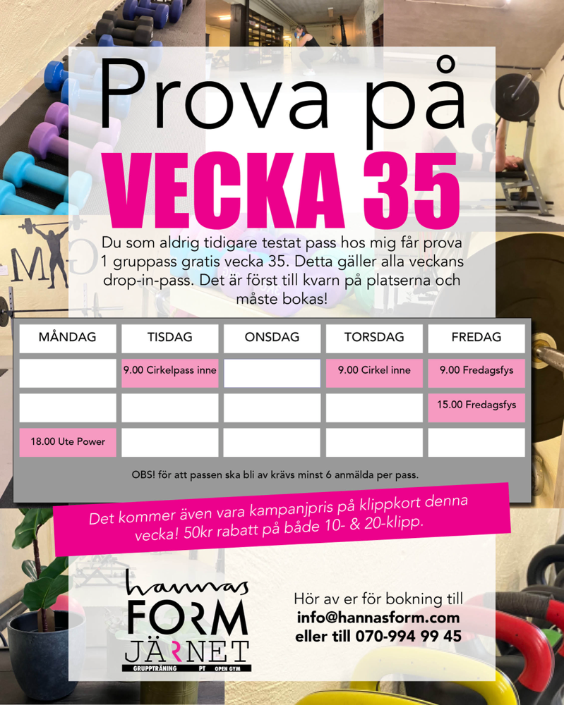 vecka 35 erbjuder jag alla som aldrig tränat hos mig att testa ett gruppass eller ett tillfälle open gym gratis! Du som tidigare tränar eller tränar regelbundet hos mig är självklart också välkommen!